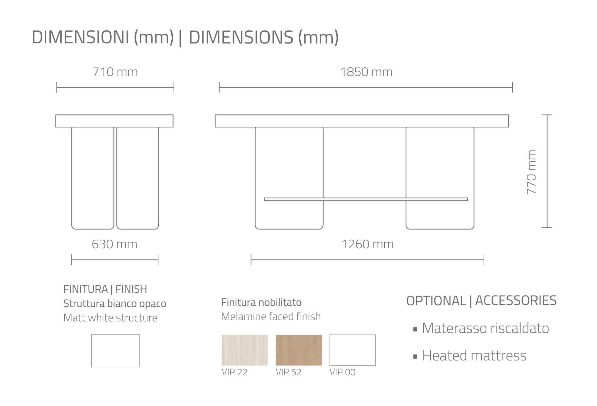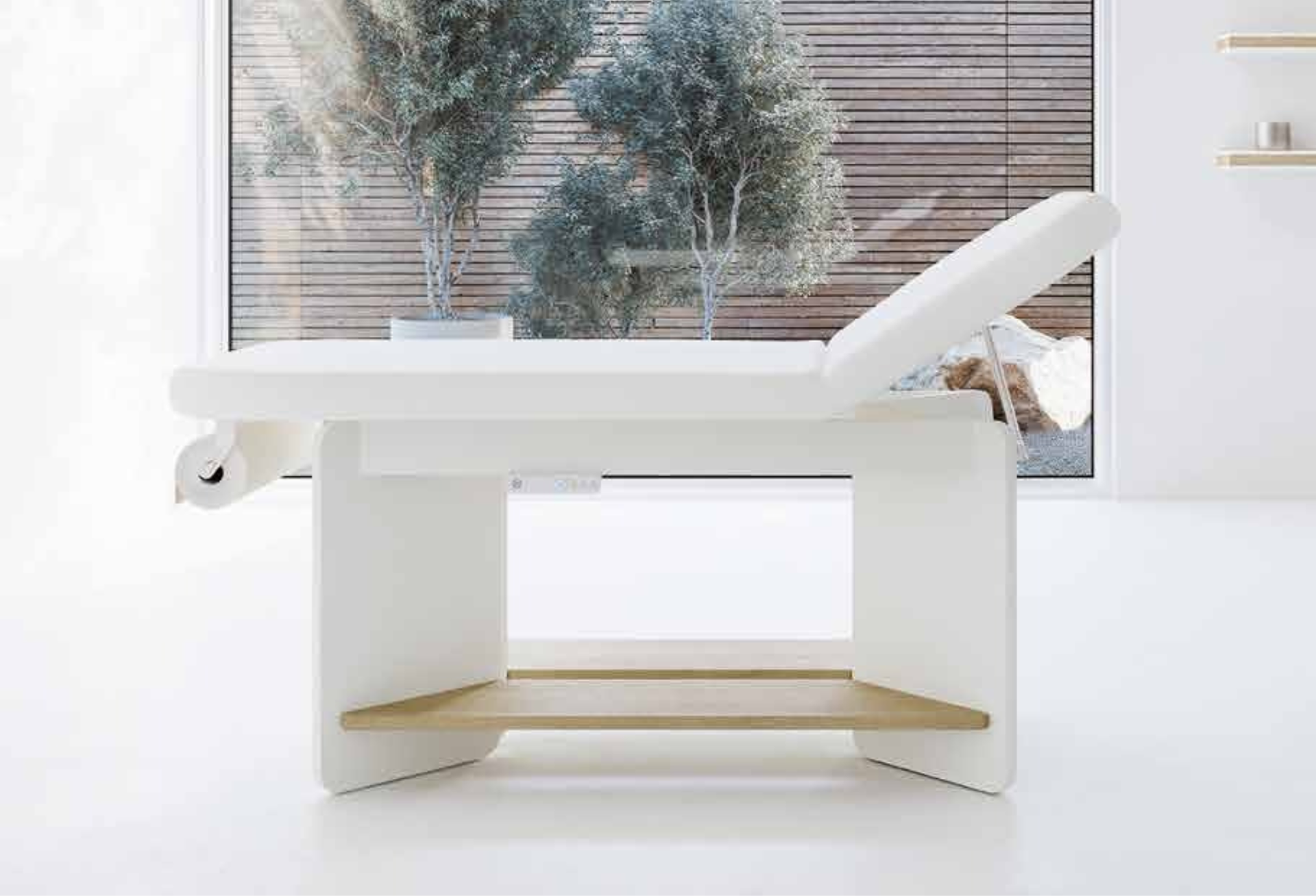 VIS è un lettino da massaggio dal design funzionale ed elegante. Realizzato in nobilitato, presenta un materasso in skai bianco con foro facciale, tappo e portarotolo. La testata è regolabile manualmente. Il piano d’appoggio è disponibile in 3 finiture coordinate.